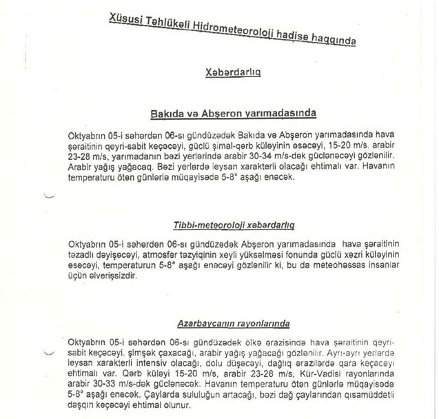 Hava ilə bağlı bütün qurumlara xəbərdarlıq edilib