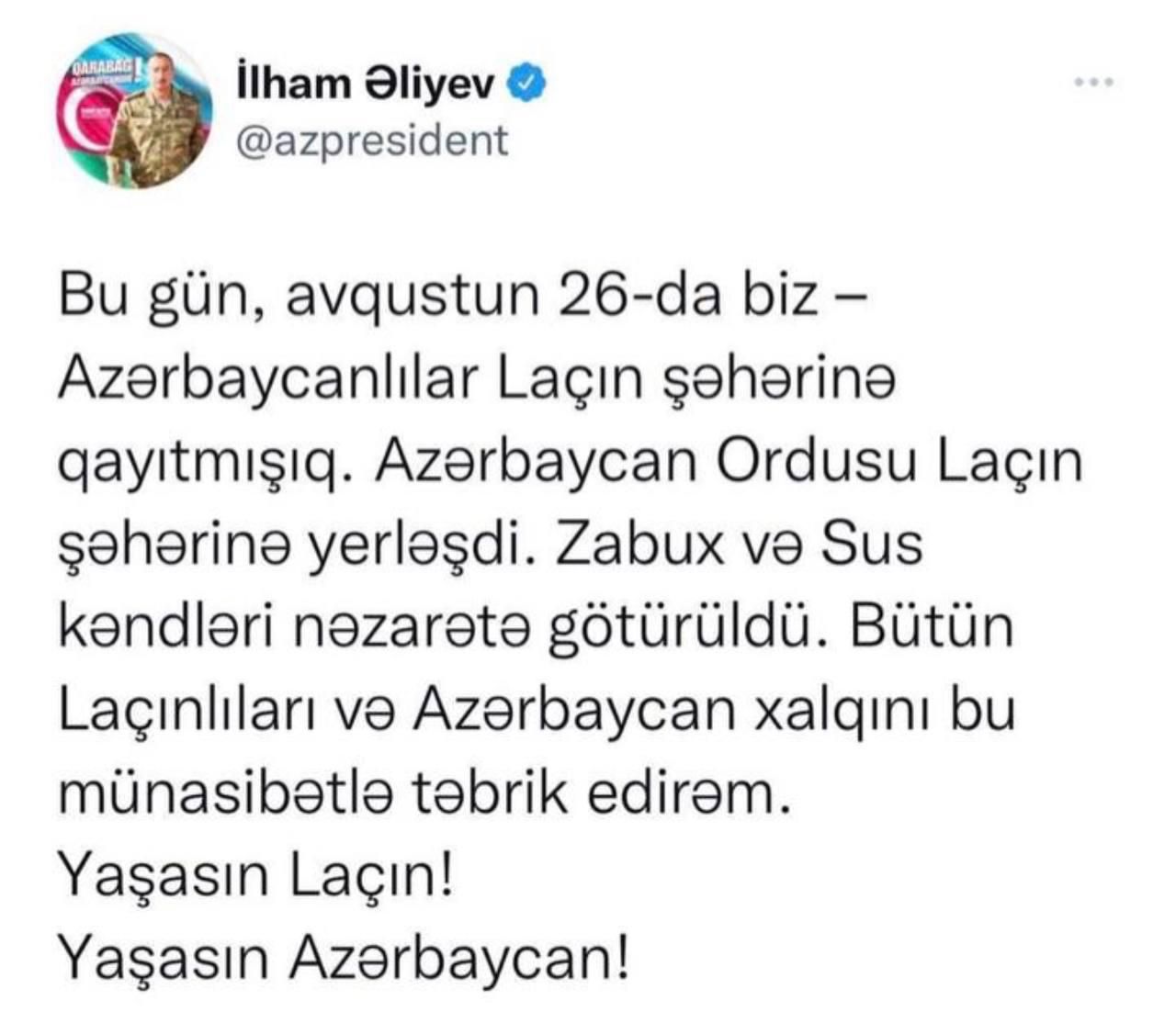 Paylaşımda deyilir: "Bu gün, avqustun 26-da biz – Azərbaycanlılar Laçın şəhərinə qayıtmışıq. Azərbaycan Ordusu Laçın şəhərinə yerləşdi. Zabux və Sus kəndləri nəzarətə götürüldü. Bütün Laçınlıları və Azərbaycan xalqını bu münasibətlə təbrik edirəm. Yaşasın Laçın! Yaşasın Azərbaycan!"