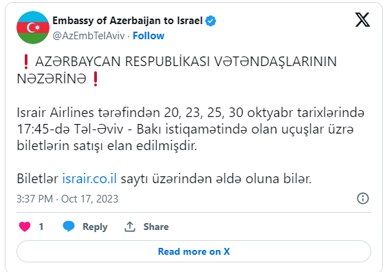 Bildirilib ki, “Israir Airlines” oktyabrın 20-si, 23-ü, 25-i və 30-da saat 17:45-də Təl-Əviv - Bakı istiqamətində olan uçuşlar üzrə biletlərin satışını elan edib.