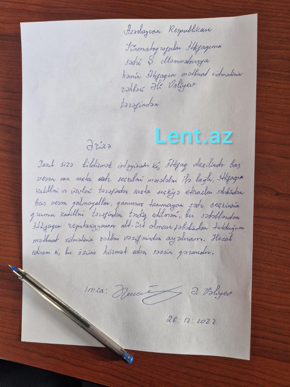 Ə.Vəliyev istefa ərizəsinin fotosunu da Lent.az-a təqdim edib: