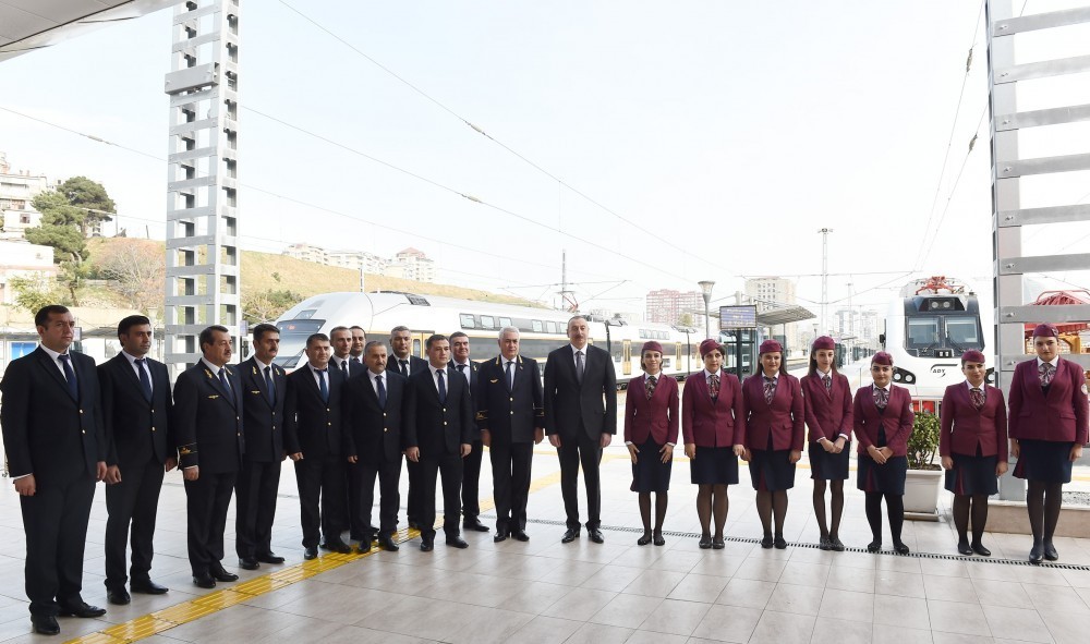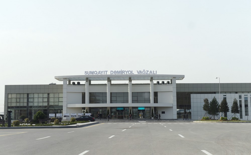 Azərbaycan Respublikasının Prezidenti İlham Əliyev noyabrın 16-da Sumqayıta səfəri çərçivəsində Dəmir Yolu Vağzalı Kompleksinin açılışında iştirak edib. Dövlət başçısı İlham Əliyev kompleksin rəmzi açılışını bildirən lenti kəsib. “Azərbaycan Dəmir Yolları” Qapalı Səhmdar Cəmiyyətinin sədri Cavid Qurbanov Sumqayıt dəmir yolu stansiyasının tikintisi, Bakı dairəvi, Ləki-Qəbələ, Astara-Astara dəmir yolu xətlərinin çəkilişi ilə bağlı görülən və bundan sonra layihələrdə nəzərdə tutulan işlər barədə dövlətimizin başçısında məlumat verib. Üçmərtəbəli Sumqayıt dəmir yolu vağzalının sahəsi 5,5 min kvadratmetrdir. Binada gözləmə zalı, bilet kassaları, məlumat bürosu, server otağı, əşyaların saxlanması kamerası yaradılıb və yaxın günlərdə burada ticarət mərkəzinin istifadəyə verilməsi planlaşdırılır. Bundan əlavə, stansiyada 7 yol yenidən qurulub və çəkilmiş dəmir yollarının ümumi uzunluğu 5 min 20 paqonmetrdir. Kompleksdə 12 yol dəyişən quraşdırılıb, uzunluğu 43 metr olan yeraltı piyada keçidi və platformaya yeraltı çıxış keçidi inşa edilib. Sonra Prezident İlham Əliyev Sumqayıt-Bakı marşrutu üzrə hərəkət edən sərnişin qatarı ilə Bakıya gəlib. Qeyd edək ki, son illərdə lokomotiv və vaqon parklarının yenilənməsi və digər sahələrin müasir tələblər səviyyəsinə çatdırılması istiqamətində İsveçrənin “Stadler Rail Group” şirkətindən KİSS markalı ikimərtəbəli elektrik qatarları alınaraq ölkəmizə gətirilib. Həmin qatarlar 2015-ci ildə Bakı-Sumqayıt marşrutu ilə hərəkətə buraxılıb. Saatda 160 kilometr sürətlə hərəkət edən və 4 vaqondan ibarət olan elektrik qatarlarının hər birinin ümumi sərnişin tutumu 700 nəfər, oturacaq yerlərin sayı isə 367-dir. Bakı dəmir yolu vağzalına gələn Prezident İlham Əliyev burada 2016-cı ildən bəri alınmış yeni sərnişin qatarları, lokomotivlər və müxtəlif dəmir yolu texnikalarına baxıb. “EVOLUTİON” seriyalı teplovoz Qazaxıstan istehsalıdır və saatda 120 kilometr sürətlə hərəkət edir. Sabit cərəyanla işləyən lokomotiv isə Gürcüstanda istehsal olunub və sürəti saatda 100 kilometrdir. Dövlət başçısına “Alstom Transport” ikisistemli sərnişin lokomotivi də təqdim olunub. Bu lokomotiv sabit, həmçinin dəyişən cərəyanla işləyir və saatda 160 kilometr sürətlə hərəkət edir. Bütövlükdə Avstriya, Rusiya, Çexiya və digər ölkələrdən alınan yeni lokomotiv və avadanlıqlar təmir-tikinti və istismar proseslərinin tamamilə avtomatlaşdırılmasına və mexanikləşdirilməsinə imkan yaratmaqla dəmir yollarında daşımaların təhlükəsizliyini gücləndirəcək, xüsusilə də sərnişinlərə xidməti daha yüksək səviyyəyə qaldıracaq. Sonda xatirə şəkli çəkdirilib.