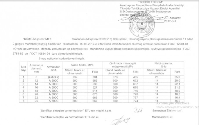Bu tip yoxlamanın sonuncusu 12.12.2018ci tarixində Azərbaycan Respublikası Fövqəladə Hallar Nazirliyi Tikintidə Təhlükəsizliyə Nəzarət Dövlət Agentliyi tərəfindən aparılmış, nəticələri isə 18.12.2018ci il tarixdən podratçı şirkətə təqdim edilmişdir. (Laboratoriya yoxlama nəticələri araşdırmamıza əlavə edilir). S.Ə.Dadaşov adına Elmi-Tədqiqat və Layihə-Konstruktor İnşaat Materialları İnstitutunun laboratoriyanın təqdim etdiyi nəticələrə tərəfimizdən baxış keçirildi, məlum oldu ki qeyd edilən layihələrdə istifadə edilən armatur materialları tələb edilən qayda və normalara tam uyğundur, inşaat zamanı heç bir əlavə ölkənin və ya sexlərin keyfiyyətsiz və tələblərə cavab verməyən materiallarından istifadə edilməyib.