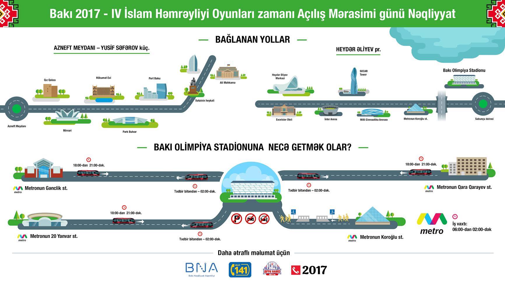 Bakı Nəqliyyat Agentliyi Bakı 2017- IV İslam Həmrəyliyi Oyunlarının açılışı günü bağlanan yolların sxemini hazırlayıb. BNA-dan Avtosfer.az-a daxil olan məlumata görə, sxemdə Bakı Olimpiya Stadionuna ən rahat yolun təsviri verilib.