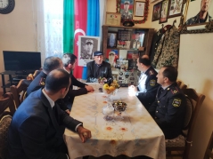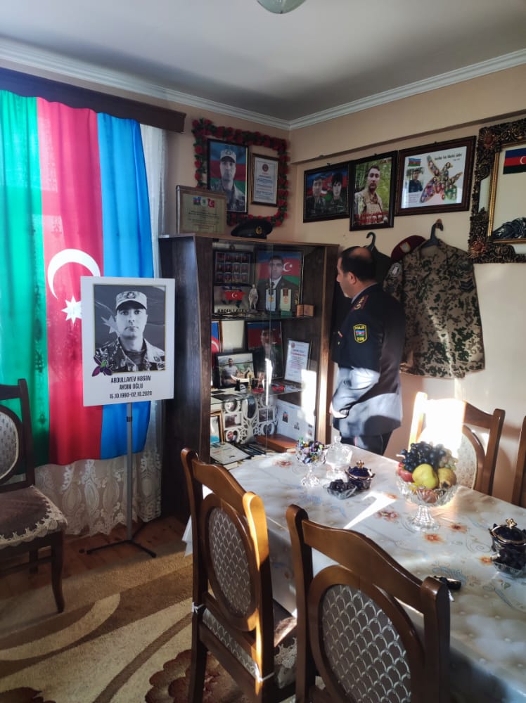 Kəlbəcər rayon Polis Şöbəsinin əməkdaşları 8 noyabr- Zəfər Günü münasibətilə Vətən Müharibəsində torpaqlarımızın işğaldan azad edilməsi uğrunda gedən döyüşlərdə şəhid olan Daxil Qoşunlarının hərbi qulluqçuları Seymur Həsənli və Həsən Abdullayevin ailə üzvlərini ziyarət edib. Şöbə rəhbərliyi ilk növbədə şəhidlərimizin məzarlarını ziyarət edib, üzərinə çiçəklər düzüb və ruhuna dualar oxuyub. Daha sonra ailə üzvləri ilə görüşülüb, onların şərəfli ömür yolundan, torpaqlarımızın işğaldan azad edilməsi uğrunda gedən döyüşlərdəki şücaətindən bəhs edilib. Bütün şəhidlərimizin əziz xatirəsinin qəlblərdə əbədi yaşayacağı vurğulanıb.
