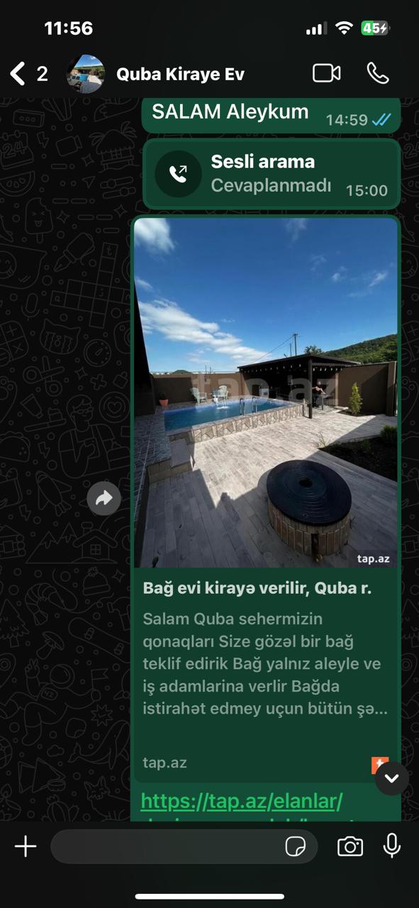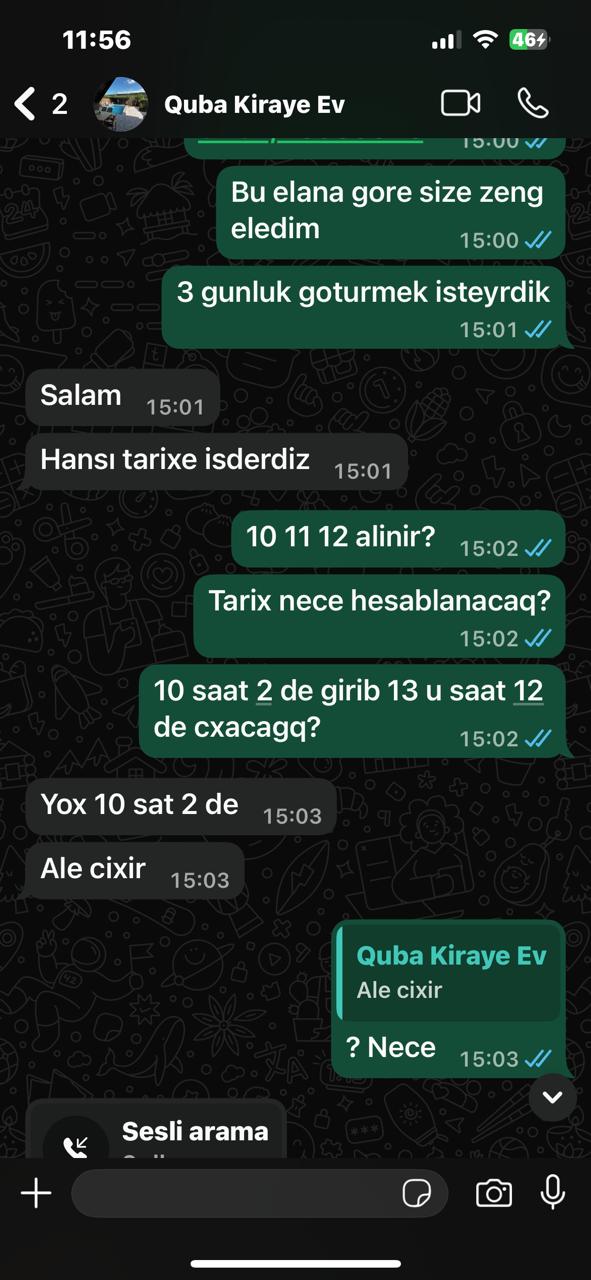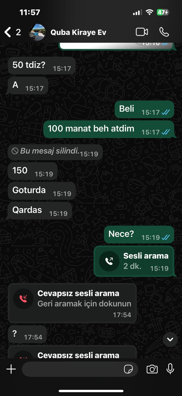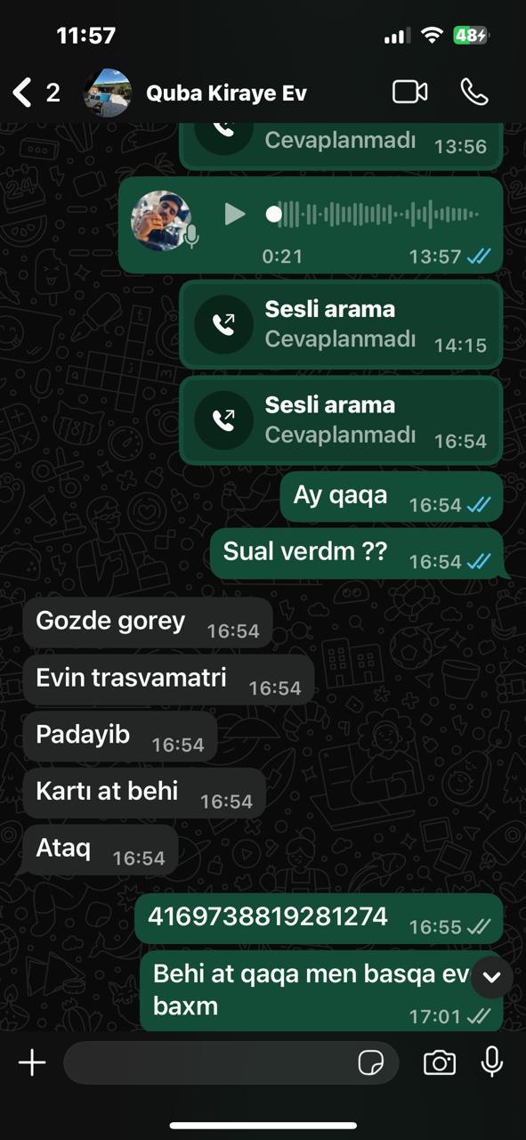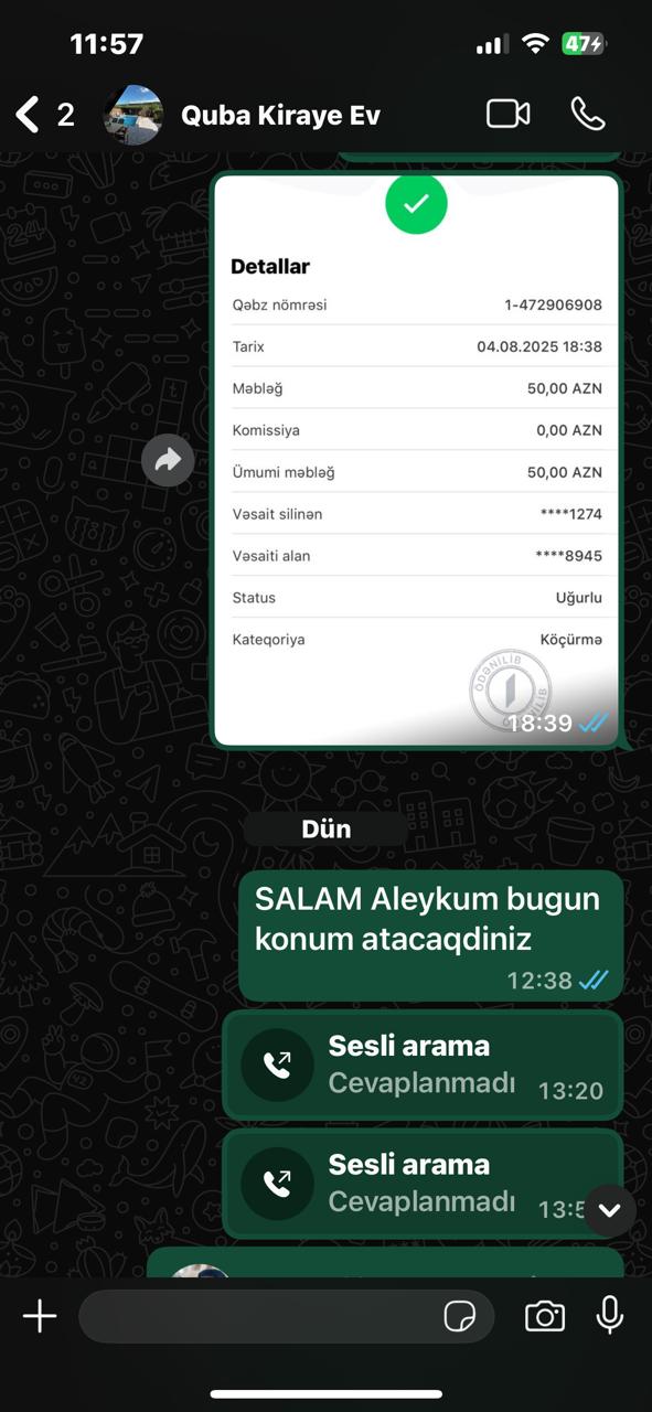 Belə bir şikayət Avtosfer.az-ın “WhatsApp” xəttinə daxil olub. Bildirilib ki, tətil üçün rayona getmək istəyən şəxs internetdə rast gəldiyi elanda qeyd olunan mobil nömrə ilə əlaqə saxlayaraq kirayə ev barədə razılığa gəlib və ilkin olaraq 50 manat beh göndərib. Lakin daha sonra fırıldaqçı ona əlavə 100 manat da beh göndərməsini tələb edib. Səbəb kimi isə evin “əsas sahibi” ilə behin azlığına görə mübahisə yaşandığını deyib və başqa ev təklif edib.