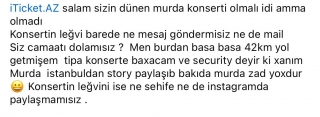“Dünən “Murda” konserti olmalı idi, amma keçirilmədi. Konsertin ləğv olunması barədə nə SMS, nə də e-mail göndərilib. Mən konsertə gəlmək üçün 42 kilometr yol qət etdim, amma məkanın qarşısında təhlükəsizlik işçiləri mənə dedilər ki, “Murda” İstanbulda “story” paylaşıb, Bakıda isə konsert yoxdur. Bu barədə “iTicket”in nə səhifəsində, nə də sosial şəbəkə hesablarında heç bir məlumat yerləşdirilməmişdi. Siz camaatı aldatmısınız?”