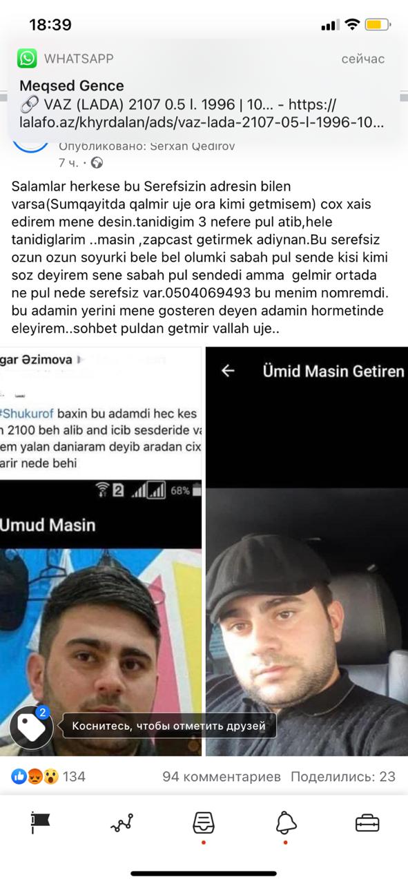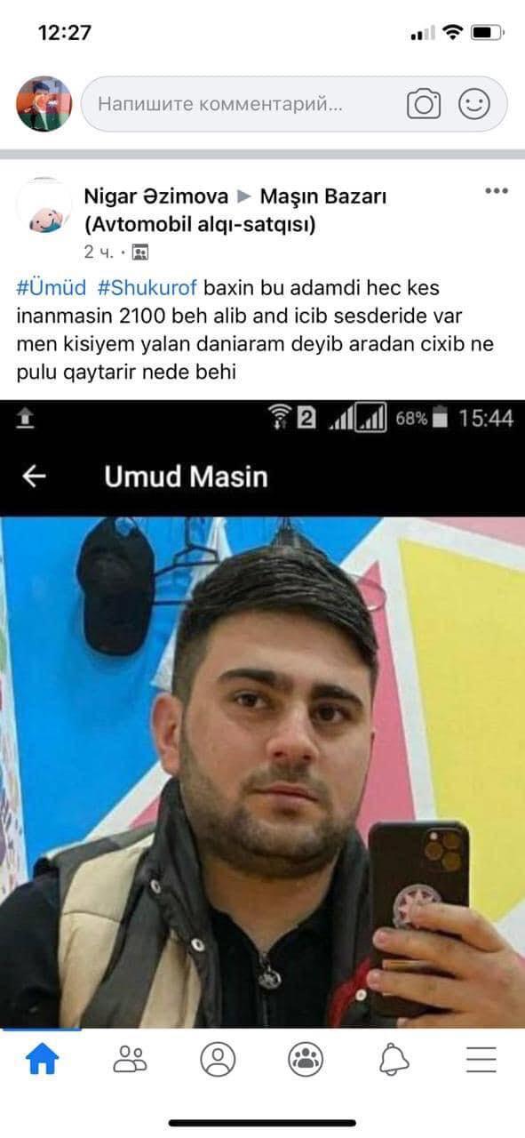 Daha bir şəxs də onun fırıldaqçılıq etməsi ilə bağlı məlumat paylaşıb. Belə ki, sosial şəbəkə istifadəçisi qeyd edir ki, Ümüd Şükürov onun 3 tanışından maşın almaq, ehtiyyat hissəsi gətirmək bəhanələri ilə hərəsindən müəyyən məbləğdə pul mənimsəyib.