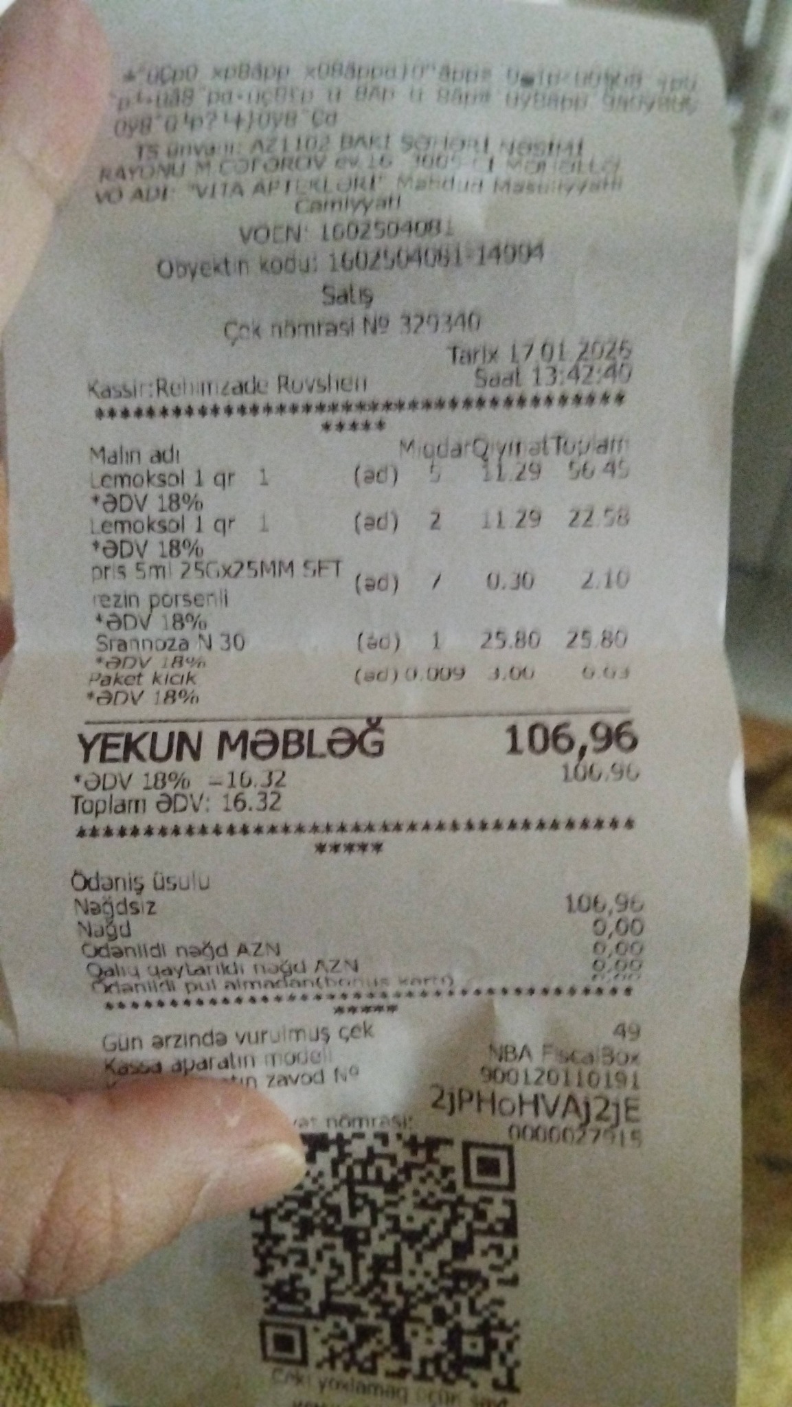 Şikayətçi bildirir ki, Buta aptekindən 106 AZN məbləğində dərman alışı edib. Lakin əməliyyatdan sonra keşbekin hesablanmamasının səbəbi kimi qəbzdə satıcının “Vita aptekləri” adı ilə göstərilməsi əsas gətirilib. Bu isə müştərini çaşdırıb, çünki alış faktiki olaraq “Buta” aptekdən edilib.