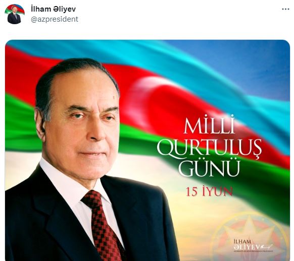 Azərbaycan Respublikasının Prezidenti İlham Əliyev tviterdəki hesabında 15 İyun – Milli Qurtuluş Günü ilə bağlı paylaşım edib.