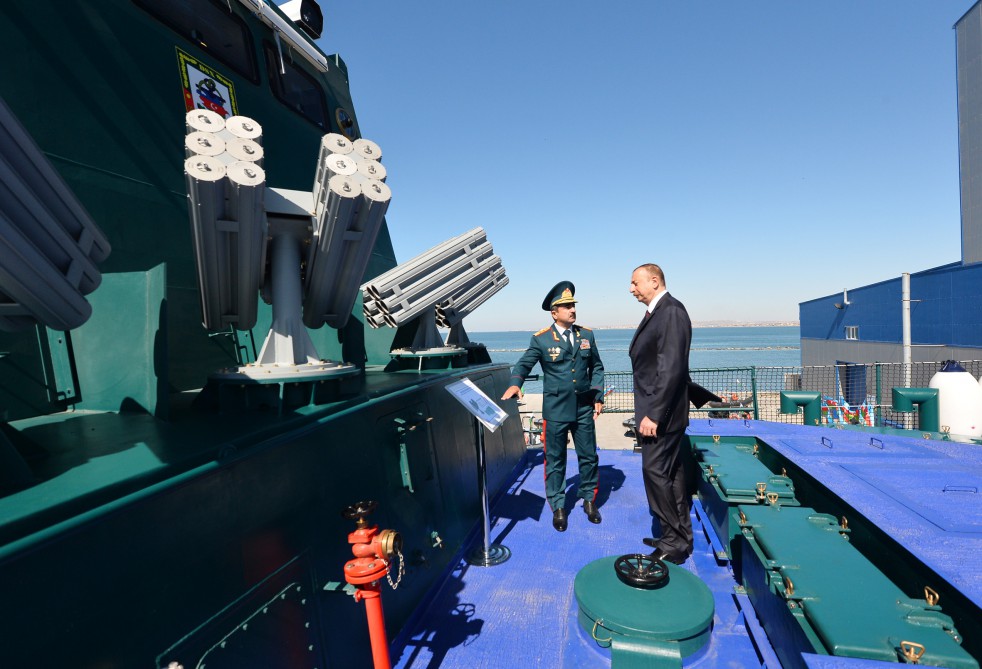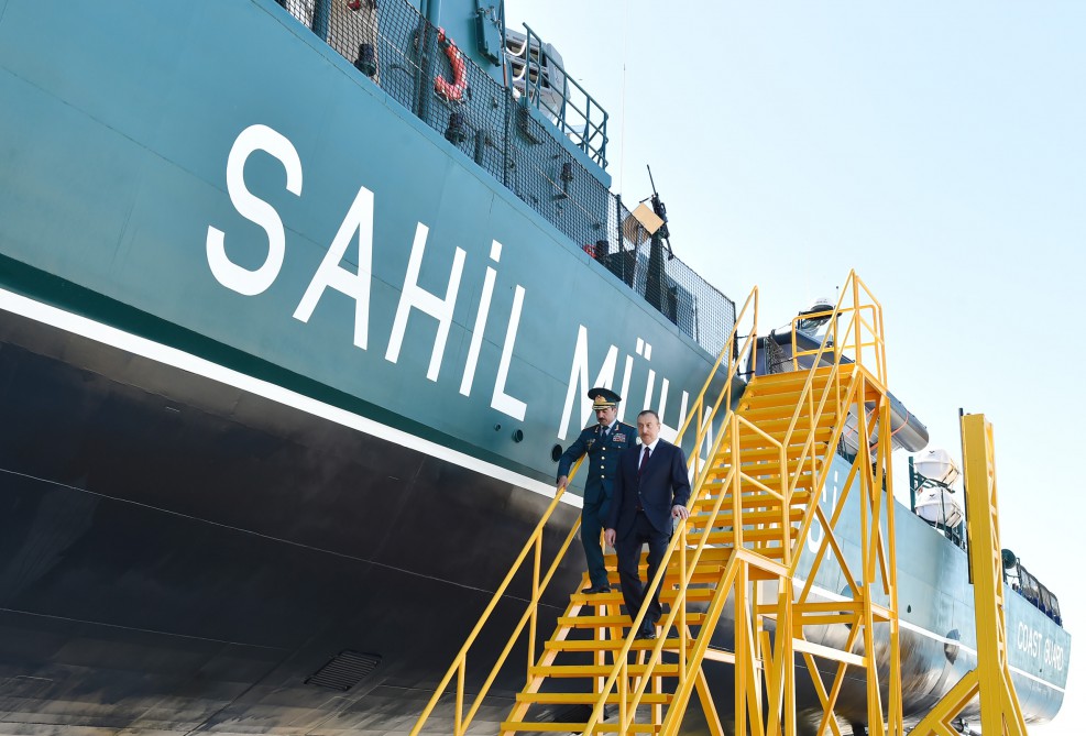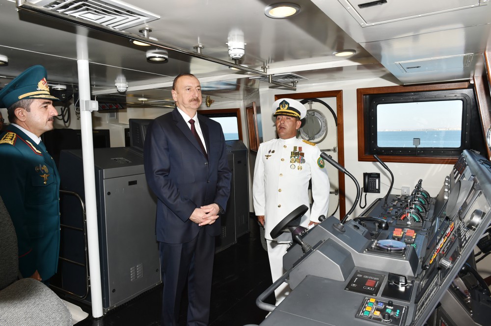 Dövlət başçısı Sahil Mühafizənin sərhəd gözətçi gəmilərinin fəaliyyətini əks etdirən filmə və onların texniki göstəriciləri ilə bağlı stendə baxdı. Məlumat verildi ki, yeni gəmi mükəmməl naviqasiya və rabitə-radiotexnika avadanlığı, müasir silahlar, o cümlədən raketlər və raket silahlarına qarşı kompleks, gecə-gündüz görmə müşahidə sistemləri və hidroakustik qurğu ilə təchiz edilib. Xəzər dənizində ağır üzmə şəraitində xidməti vəzifələri yerinə yetirə bilən və itisürətli qayıqla təchiz olunmuş sərhəd gözətçi gəmisinin uzunluğu 62 metrdir. Dəniz şəraitində göyərtəsinə helikopterin enməsi mümkün olan gəmidən dövlət sərhədlərinin mühafizəsi, sərhədboyu rejimin təmin olunması, karbohidrogen ehtiyatlarının hasilatı və nəqli infrastrukturunun təhlükəsizliyinin təmin edilməsi istiqamətində xidməti vəzifələrin icrası zamanı istifadə ediləcək. Dövlət başçısı gəmidə yaradılan şəraitlə tanış oldu.