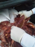 Ətin orqanoleptik baxışı keçirilərkən qaralma, daxili orqanlarında patoloji dəyişiklik müəyyən edilib və istifadəyə yararsız olduğu təsdiq olunub. “Zaqatala rayonu Bazar 2” ASC-də keçirilən monitorinq zamanı qəssab Qurbanov Elvin Eyvaz oğlunun 84 kq çəkidə heyvan cəmdəyini heç bir baytarlıq sənədi, baytarlıq ekspertiza rəyi olmadan satışa çıxardığı aşkarlanıb. Heyvanın cəmdəyinə orqanoleptik baxış keçirilərkən ətdə qaralma, selik və patoloji dəyişiklik müşahidə olunub. Heyvan cəmdəklərindən götürülən nümunələr laborator analizdən keçirilməsi məqsədi ilə Azərbaycan Qida Təhlükəsizliyi İnstitutuna təqdim olunub.