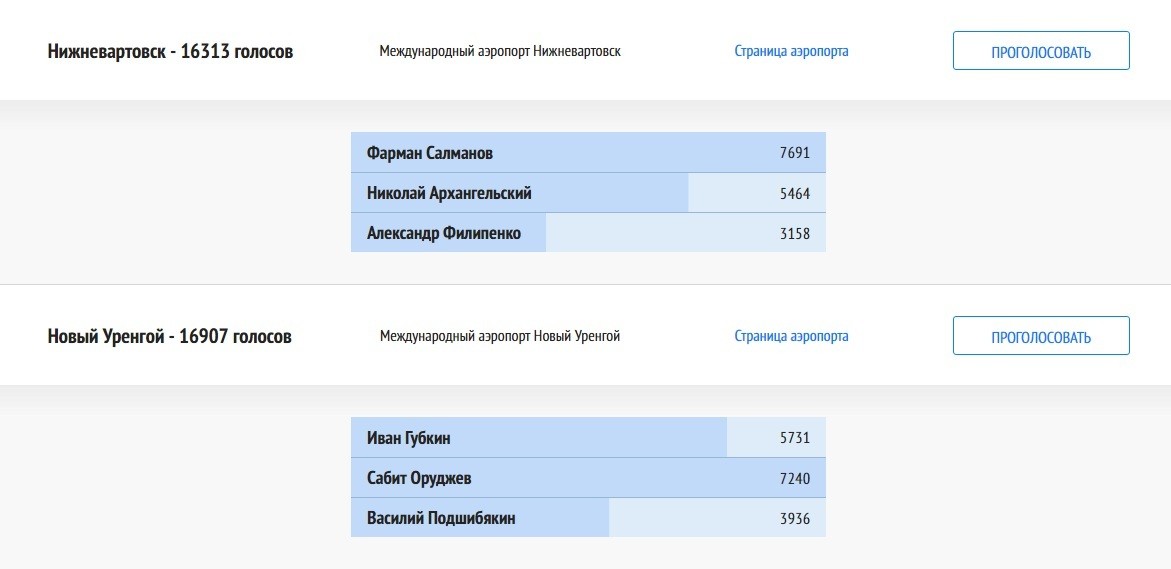 Rusiyada fəaliyyət göstərən 2 hava limanına məşhur azərbaycanlıların adları verilə bilər. Avtosfer.az “Report”a istinadən xəbər verir ki, hazırda potensial namizədləri müəyyən etmək üçün onlayn sorğu keçirilir. Sorğunun nəticələrinə əsasən, 47 yerli aeroporta müxtəlif şəxslərin adları veriləcək. Təklif edilən namizədlər arasında neft-qaz sahəsi üzrə tanınmış soydaşlarımız - Fərman Salmanov və Sabit Orucov da var. 1-ci Nijnevartovsk və və Surqut beynəlxalq hava limanları, 2-ci isə Yeni Urenqoy beynəlxalq aeroportu üçün əsas namizəd göstərilib. Qeyd edək ki, səsvermədə Rusiyanın mobil operatorlarına məxsus nömrəsi olan şəxslər və yerli sosial şəbəkə istifadəçiləri iştirak edə bilərlər.