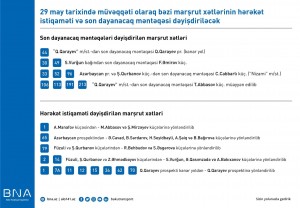 Mayın 29-da Bakıda bəzi marşrut xətləri üzrə avtobusların hərəkət istiqaməti və son dayanacaq məntəqəsi müvəqqəti olaraq dəyişdiriləcək. Bu barədə Avtosfer.az-a Bakı Nəqliyyat Agentliyindən (BNA) məlumat verilib. Məlumata görə, 44, 30, 49, 33, 52, 96, 106, 113, 191 və 213 saylı marşrutların son dayanacağı dəyişdirilib. Bundan əlavə, 1, 65, 79, 2, 14, 7A, 11, 12, 15, 36, 62 və 70 saylı marşrutların isə hərəkət istiqaməti dəyişdirilib.