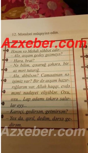 ""Allah haqqı, evdə məni "nadayet" ediblər" - Şagirdlərə öyrədilən Azərbaycan dili kitabında biabırçılıqAzərbaycanda orta məktəb dərsliklərində vulqar ifadələr zaman-zaman mətbuatın gündəminə gəlir. Avtosfer.az xəbər verir ki, azxeber.com-a müraciət edən Kazım Əliyev adlı valideyn də dərsliklərdə olan dialoqlarla bağlı narazılığını bildirib. O deyib ki, övladı 8-ci sinifdə təhsil alır və 8-ci sinif Azərbaycan dili dərsliyində olan dialoq onu narahat edir: "Mənim övladım kitabda yazılan bu sözləri gündəlik həyatında da istifadə etməyə başlayıb. O "brat", nadayet eləmə", "təkərə salma məni" və başqa ifadələri dilinə düşüb. İrad bildirində isə kitabı istinad olaraq göstərir. Təhsil Nazirliyi belə şeylərə nəyə görə icazə verir, hələ də anlamıram". Qeyd edək ki, bu dialoq müqayisə xarakterli verilib.
