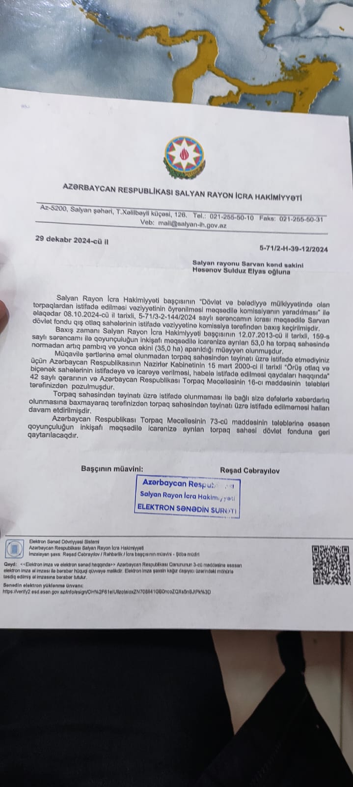 Belə ki, Salyan rayonu Sarvan kənd sakinləri, xüsusən fermerlər 5 ay əvvəl rayona təyin edilən icra başçısı Rüstəm Xəlilovdan narazı olduqlarını bildiriblər. Sosial şəbəkələrdə fermerlər onlara icarə müqaviləsi əsasında verilən torpaqların icra başçısının əmri ilə əllərindən alındığını bildiriblər.