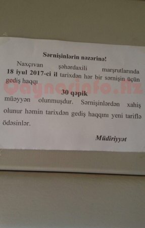 Bununla bağlı sərnişinlərə edilən xəbərdarlıqda "Naxçıvan şəhərdaxili marşrutlarında 18 iyul 2017-ci il tarixdən hər bir sərnişin üçün gediş haqqı 30 qəpik müəyyən olunmuşdur. Sərnişinlərdən xahiş olunur həmin tarixdən gediş haqqını yeni tariflə ödəsinlər" deyilir.