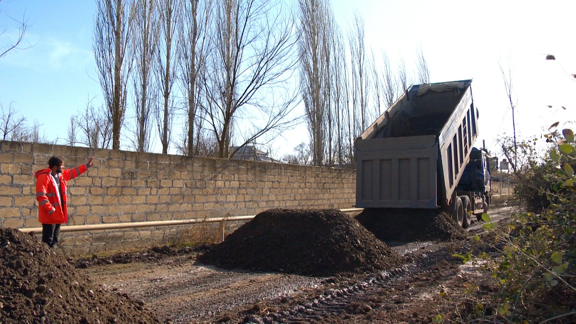 Tikinti layihəsinə uyğun olaraq, mövcud yol örtüyü və zəruri olan yerlərdə yol yatağının yararsız qruntu mexanizmlə qazılaraq çıxarılır və kənara daşınır, torpaq yatağının bərpası və relyefdən aşağı olan hissələrin qaldırılması üçün yol boyu yararlı material tökülərək kipləşdirmə işləri aparılır. Bunun ardınca normativ qalınlıqda yol əsasının alt layının qum-çınqıl, üst layının isə optimal-qırmadaş qarışığı ilə tikintisi işləri aparılacaq. Bu işlər 220 min kv.m sahəni əhatə edəcək.