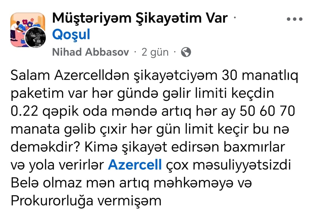 Avtosfer.az xəbər verir ki, bir vətəndaş “Azercell” mobil operatorunun tarif və internet istifadəsi ilə bağlı tətbiq etdiyi mexanizmdən ciddi narazılıq edir. Şikayətçinin sözlərinə görə, aylıq 30 manatlıq paketdən istifadə etməsinə baxmayaraq hər gün ona “limit keçmisiniz” bildirişi göndərilir və balansından əlavə olaraq 0,22 manat tutulur.