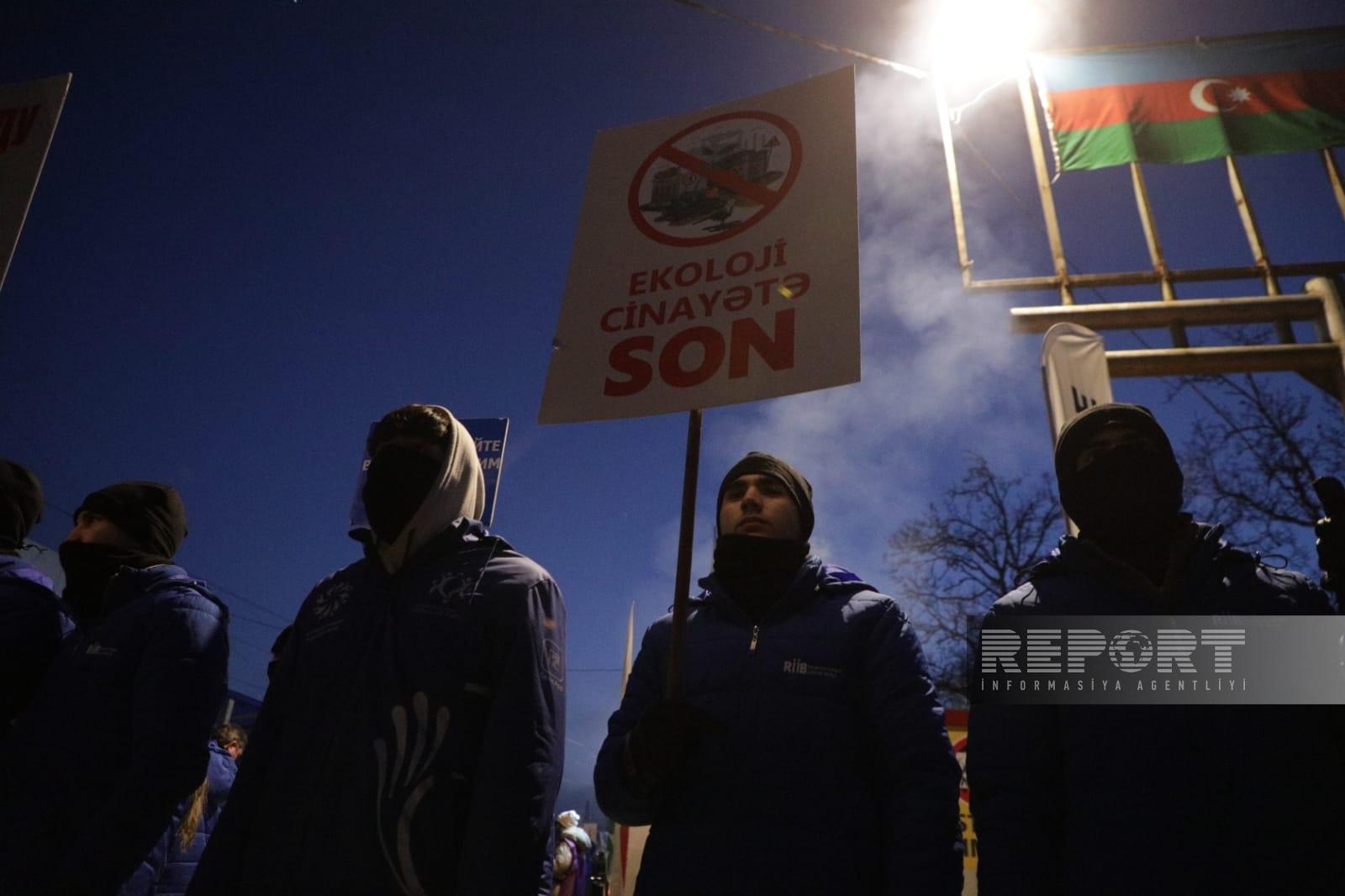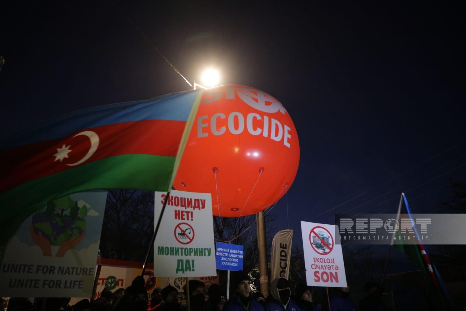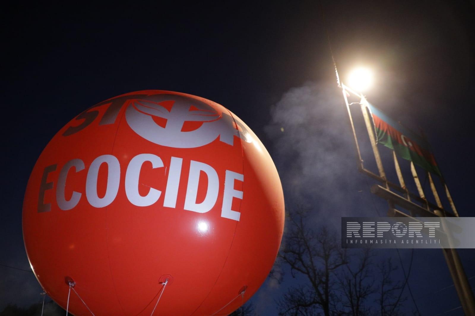 Fasiləsiz dinc aksiyanın iştirakçıları "Stop Ecocide" yazısının ətrafında bayraqlarla durublar. Daha sonra onlar "Stop Ecocide” və digər şüarlar səsləndiriblər.