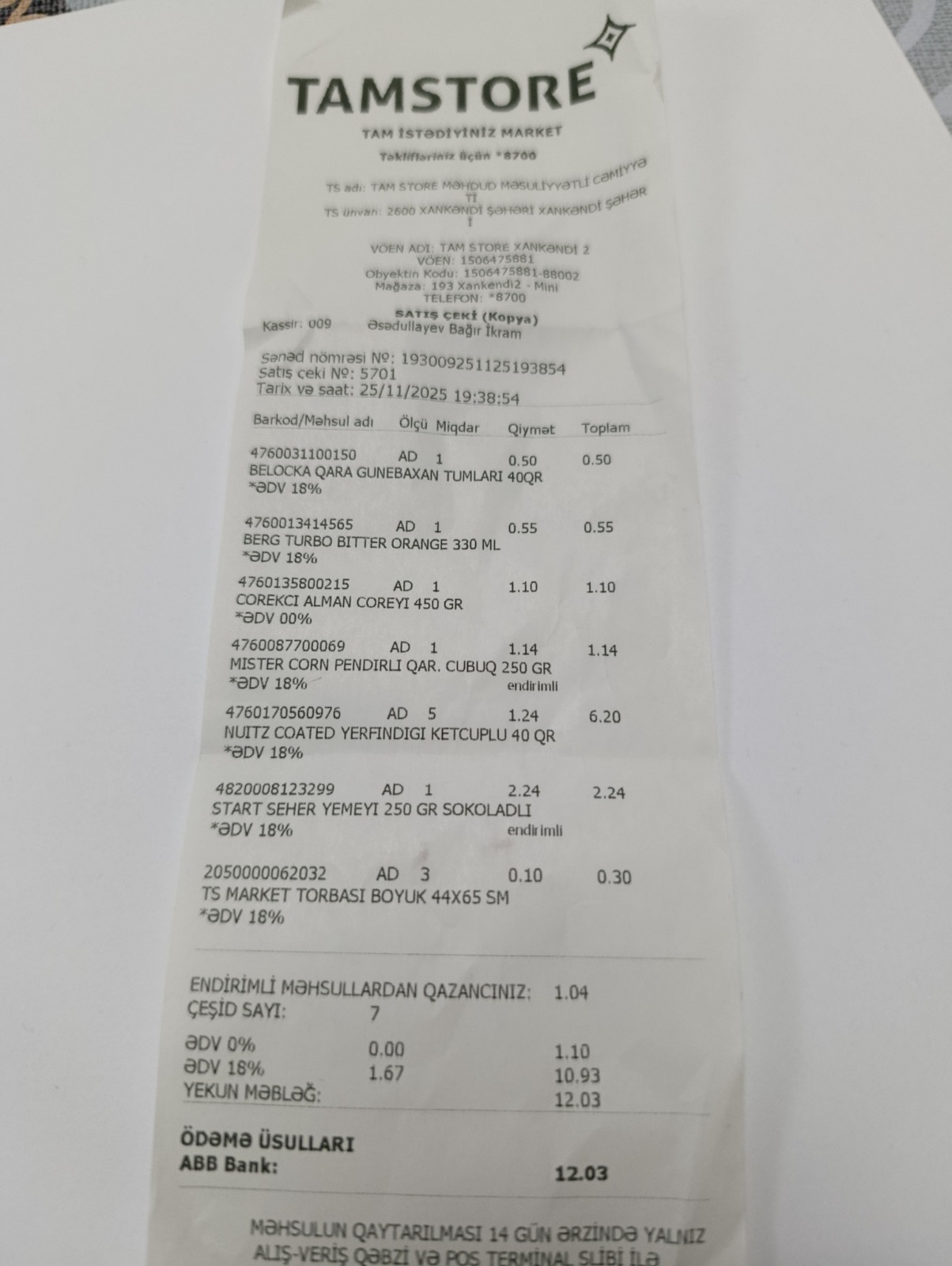 “Hörmətli Xankəndi sakinləri və "Tamstore" marketlər şəbəkəsinin rəhbərliyi! Alış-veriş zamanı vitrində 0.38 qəpik olaraq qeyd olunan yerfındığı kassada 1.24 qəpik olaraq keçdi. Məsələni kassada araşdırarkən digər bir vətəndaşın da eyni problemlə üzləşdiyinin şahidi oldum. Başqa bir müştəri isə vitrinində 7.40 manat olaraq göstərilən 2 litrlik “Xırdalan” pivəsinin kassadan təxminən 8 manatdan baha olaraq keçdiyini bildirirdi və haqlı narazılığını ifadə edirdi.