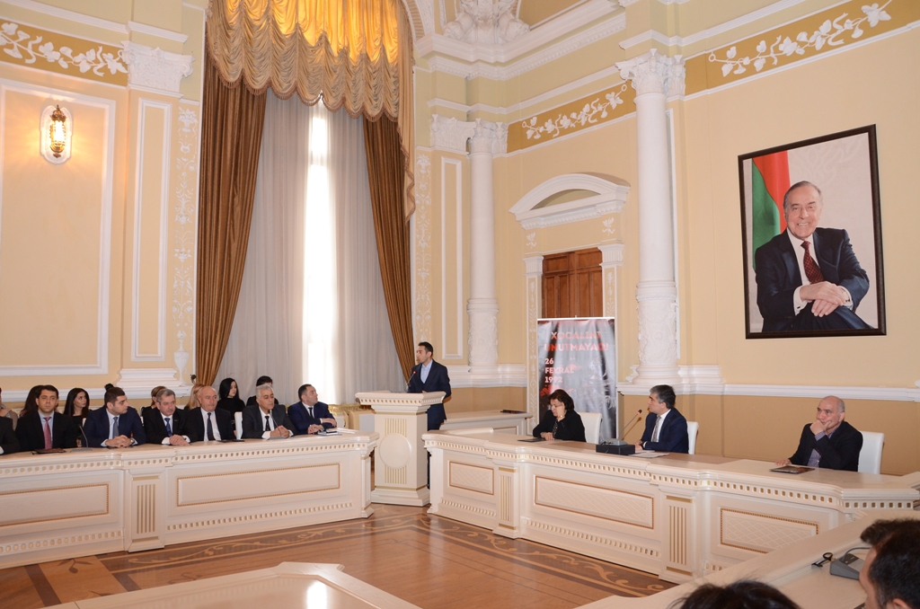 Tarixçi alimlər, ziyalılar, paytaxtın ali məktəblərinin tələbələri, gənclər, mədəniyyət işçiləri, könüllülərin iştirakı ilə faciənin ildönümünə həsr olunmuş tədbiri Bakı Şəhər İcra Hakimiyyəti başçısı Aparatının İctimai-siyasi, humanitar məsələlər və dini qurumlarla iş şöbəsinin müdiri Elmin İmanov açaraq Azərbaycan xalqının qan yaddaşı olan Xocalı faciəsi, ermənilərin zaman-zaman xalqımıza qarşı törətdikləri vəhşiliklər və Xocalı soyqırımı ilə bağlı həqiqətlərin dünya ictimaiyyətinin nəzərinə çatdırılması üçün görülməsi vacib olan işlər barədə məlumat verib. Bildirilib ki, bu faciənin geniş ictimaiyyətə çatdırılması üçün Azərbaycan xalqının ümummilli lideri Heydər Əliyevin böyük əməyi olub. Məhz onun təşəbbüsü ilə Aərbaycan Respublikasının Milli Məclisində ilk dəfə bu məsələyə siyasi qiymət verilmiş, faciənin dünya ictimaiyyətinin nəzərinə çatdırılması üçün işlərə başlanıb.