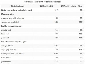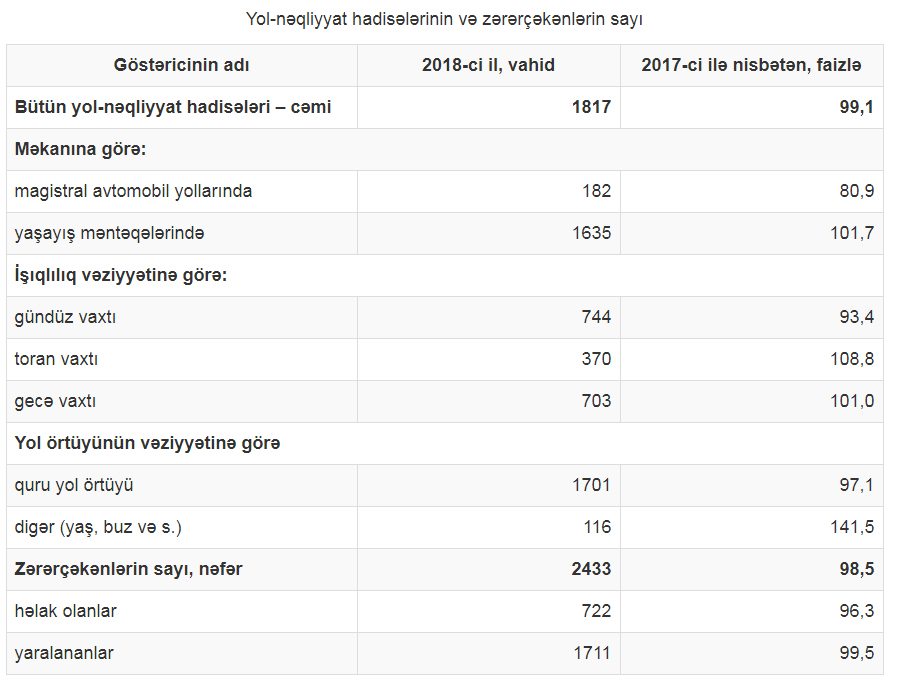Yol-nəqliyyat hadisələrinin 90 faizi yaşayış məntəqələrində baş verib, bu hadisələr nəticəsində həlak olanların sayı 2017-ci ilə nisbətən 7,3 faiz artaraq 556 nəfər, yaralananların sayı isə 0,9 faiz artaraq 1628 nəfər olub.