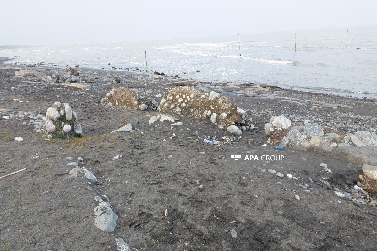 Lənkəranda geri çəkilən Xəzər dənizində nəhəng beton bünövrələr üzə çıxıb - FOTO