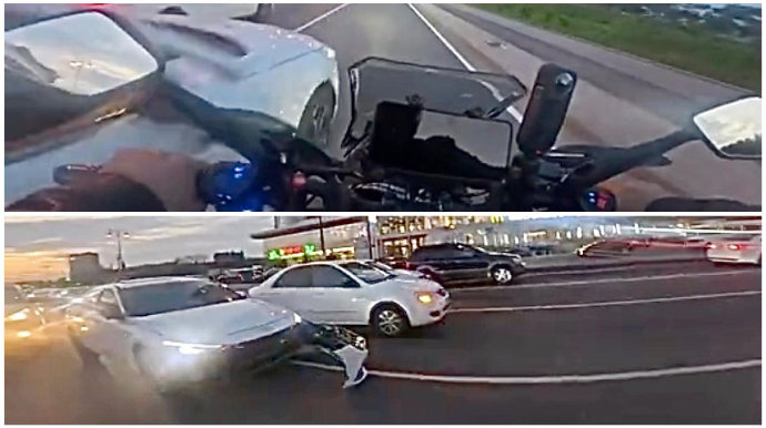 Prospektdə avtobus zolağına girən “Hyundai” motosikletlə toqquşdu; buferi qopdu - VİDEO