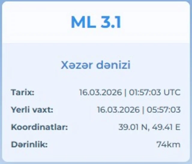 Xəzər dənizində 3.1 bal gücündə zəlzələ olub.