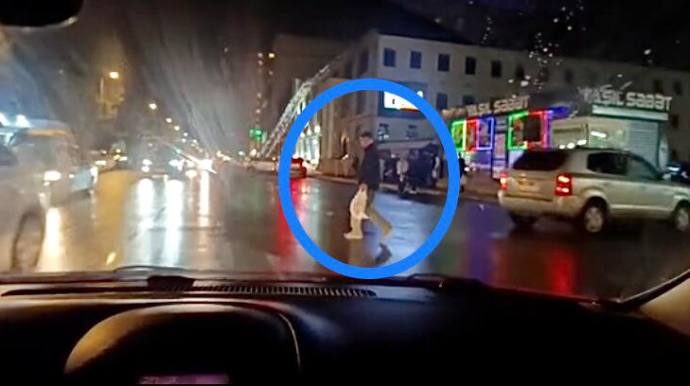 Yerə baxa-baxa yolu keçən piyada qəzadan son anda xilas oldu - VİDEO