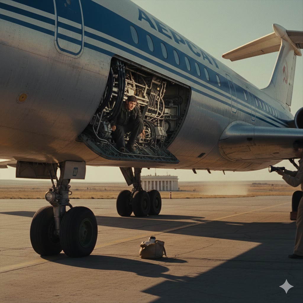 Təyyarə hava limanında olan zaman, texniki xidmət göstərildiyini görən Tofiq giclincə əsas şassilərin geri çəkildiyi girintiyə daxil olub qıvrılaraq gizlənir. Bura olduqca təhlükəli bir yerdir: təzyiq bir yana, uçuş zamanı nəhəng təkərlər və mexanizmlər sadəcə bir insanı əzə bilərdi. Bundan əlavə 10.000 metr yüksəklikdə temperatur -50°C-yə düşür ki, bir insan bu soyuğa çətin dözə bilər.