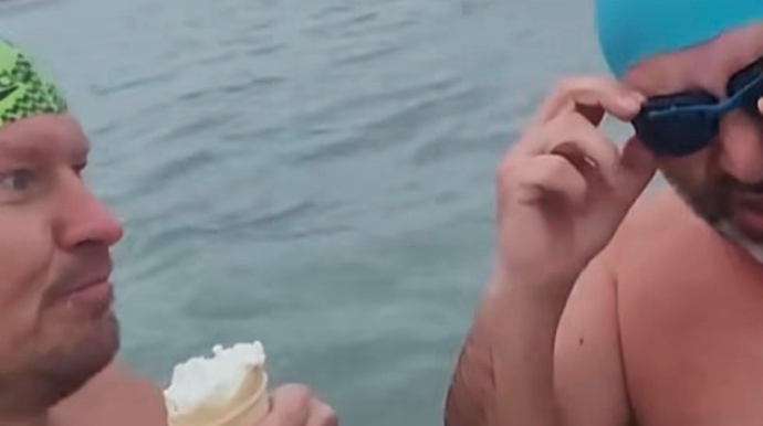 Bakıda iki üzgüçü soyuq hava olmasına baxmayaraq əllərində dondurma ilə dənizə girdilər.