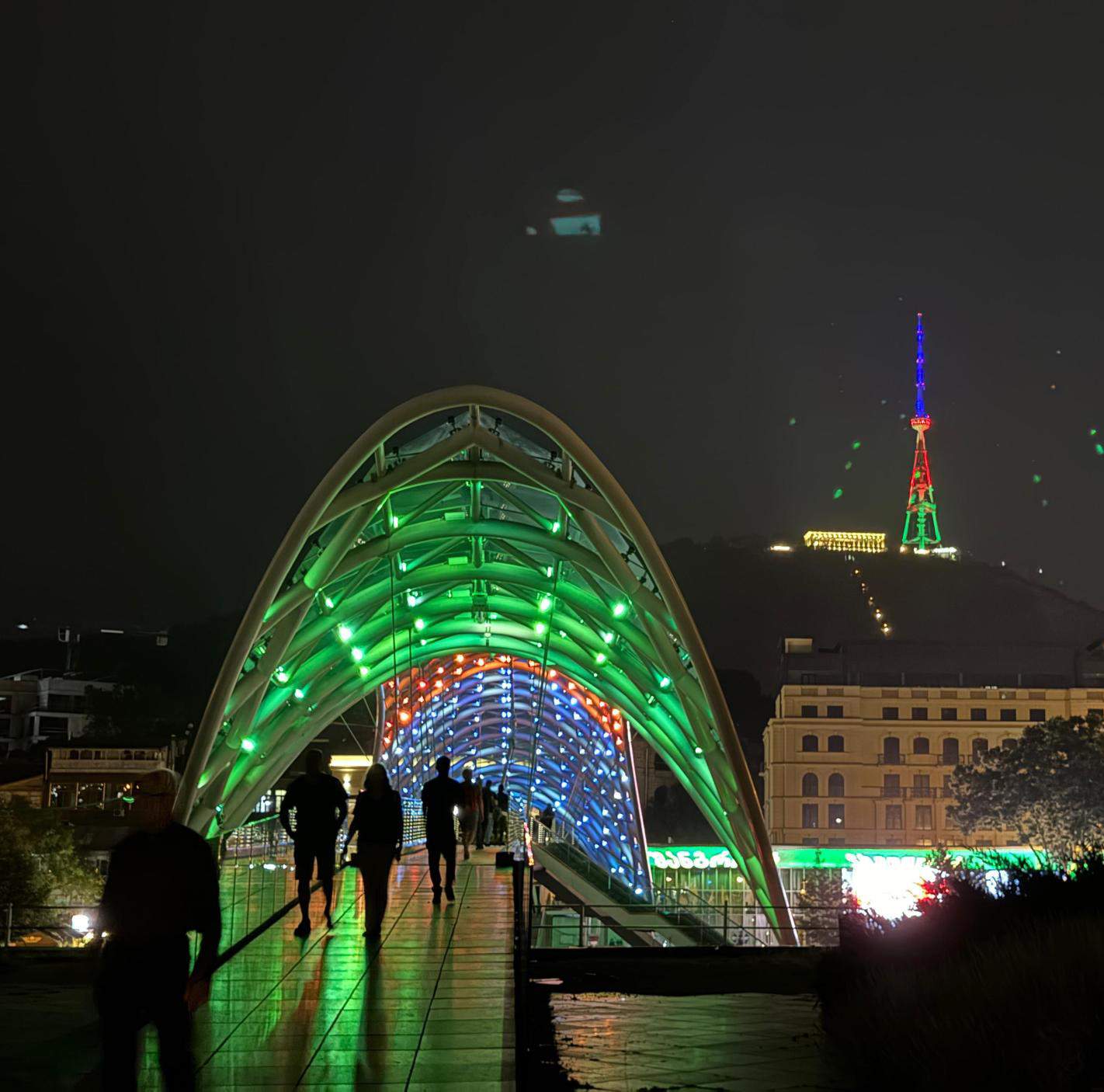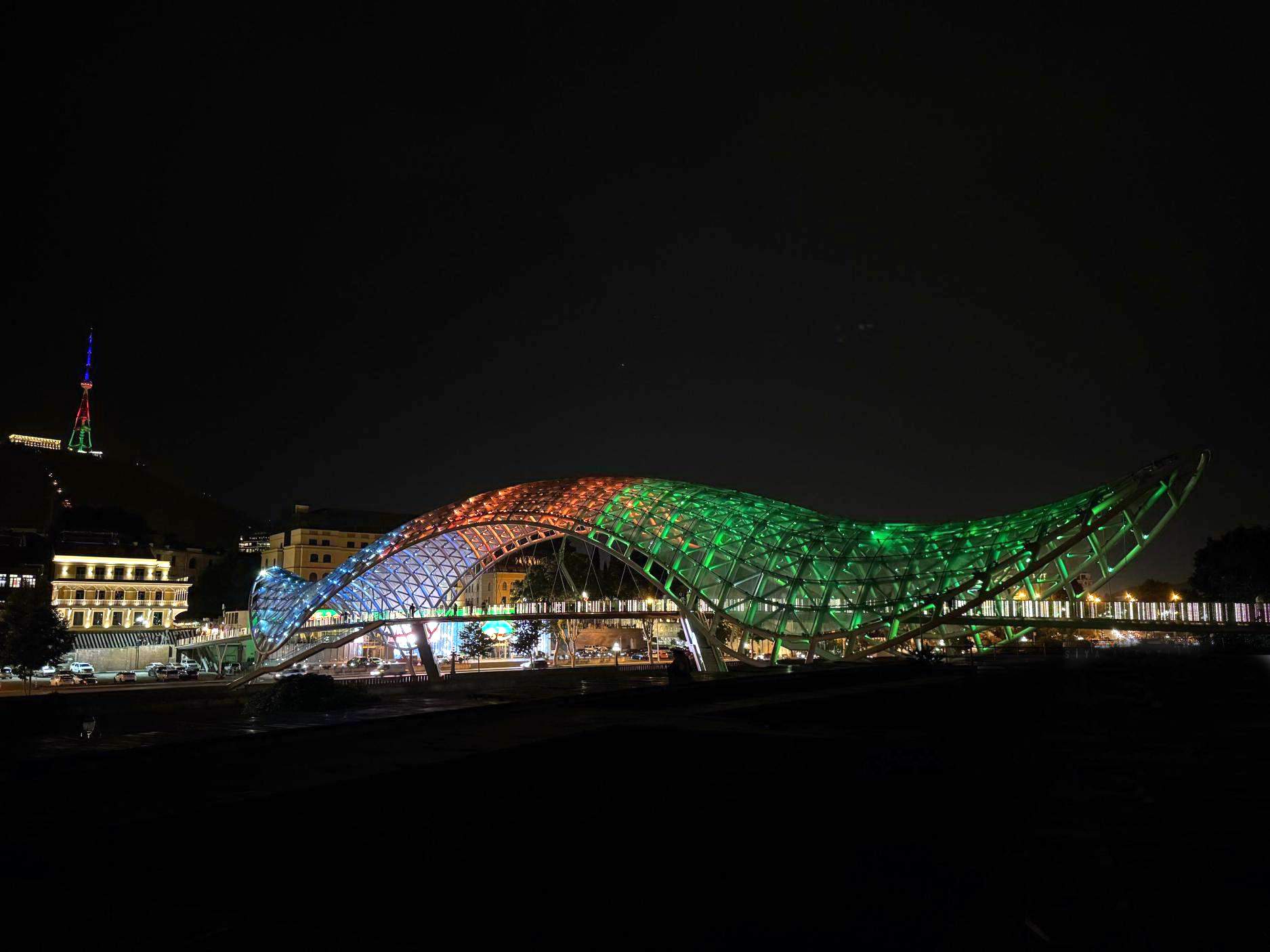 Şəhərin iki tanınmış memarlıq simvolu – Tbilisi televiziya qülləsi və Kür çayı üzərində yerləşən “Sülh körpüsü” mavi, qırmızı və yaşıl rənglərlə işıqlandırılıb.