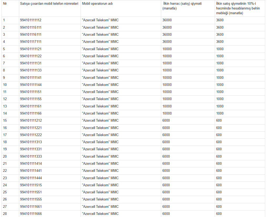 36000 manatlıq mobil nömrələr hərraca çıxarılır - SİYAHI