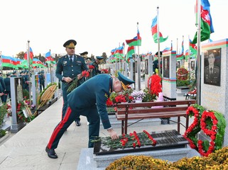 Avtosfer.az xəbər verir ki, Dövlət Sərhəd Xidmətinin rəhbər heyəti II Şəhidlər Xiyabanını ziyarət edib, ölkəmizin ərazi bütövlüyünün bərpa edilməsi, torpaqlarımızın işğaldan azad olunması uğrunda şəhadətə ucalmış Vətən övladlarının əziz xatirəsi ehtiramla yad olunaraq məzarları üzərinə gül dəstələri düzülüb.