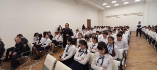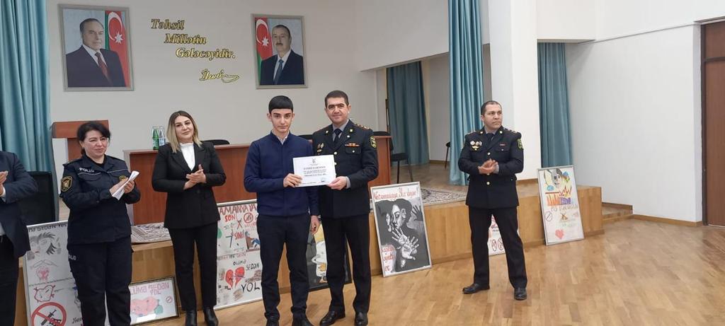Rayon Polis İdarəsinin rəisi, polis polkovniki Cavid Muradov isə rayon ərazisində polisin narkotik vasitələrin qanunsuz dövriyyəsinə qarşı keçirdiyi əməliyyat-axtarış fəaliyyətinə diqqət çəkərək, sosial şəbəkə üzərindən narkotik vasitələrin təbliğ edilməsi cəhdlərinə toxunub. Məktəbliləri ayıq-sayığ olmağa çağıran idarə rəisi yuxarı sinif şagirdlərini Polis Akademiyasına qəbul olmaqla, polisin qətiyyətli mübarizəsinə qoşula və sağlam cəmiyyətin formalaşmasında yaxından iştirak edə biləcəklərini də vurğulayıb. Bildirilib ki, gənclərin Daxili İşlər Nazirliyi sistemində təhsilə və xidmətə təşviq edilməsi DİN rəhbərliyinin də diqqət mərkəzindədir.