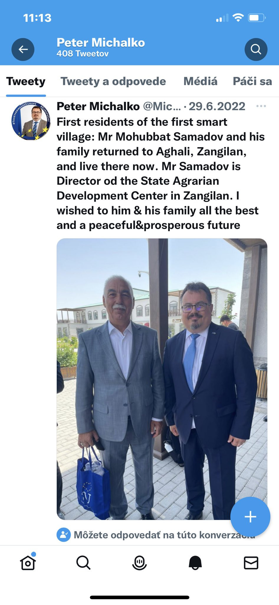 “6 aydan sonra Ağalıda. Təsirli inkişaf! Burada yaşayan bir dostla, Möhübbət Səmədovla tanış oldum, ailəsi ilə birlikdə buraya ilk qayıdan ailə kimi xoşbəxt həyat qurub. Cənab Səmədova və ailəsinə xoşbəxtlik və firavanlıq arzulayıram!”