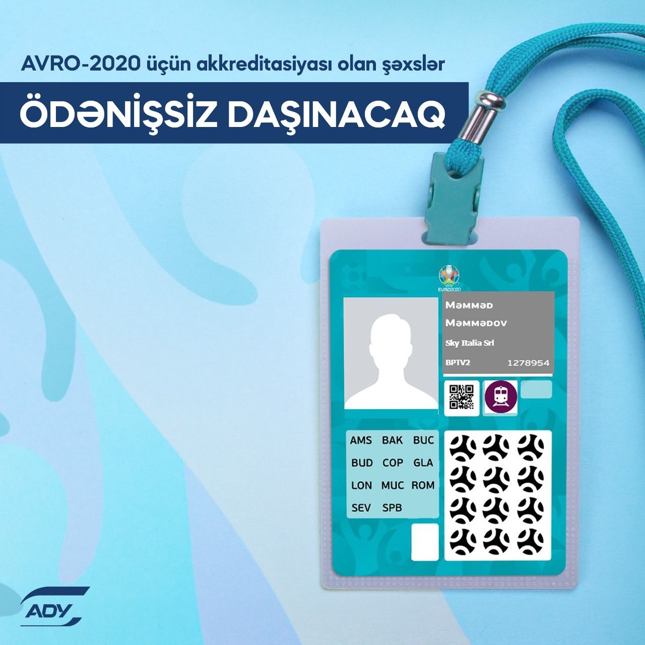 Futbol üzrə Avropa çempionatına akkreditasiyadan keçmiş şəxslərin Abşeron dairəvi dəmir yolu ilə ödənişsiz daşınmasına başlanılıb. Bu, akkreditasiyadan keçmiş şəxslərin çempionat müddətində oyunlara hazırlıq mərhələləri və oyun günlərində nəqliyyata olan tələbatlarını qarşılamaq məqsədi daşıyır. Akkreditasiyadan keçməni təsdiq edən sənədi olan hər bir şəxs 5 iyul 2021-ci il tarixinədək elektrik qatarları ilə ödənişsiz hərəkət imkanına malikdir.
