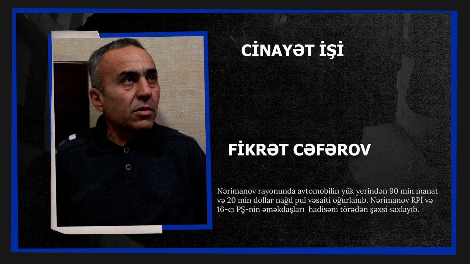 Nərimanov rayonunda talama cinayəti qeydə alınıb. Zərərçəkən paytaxt sakini polisə müraciət edərək gecə saatlarında avtomobilinin yük yerindən *90 min manat və 20 min dollar nağd pul* vəsaitinin oğurlandığını bildirib.
