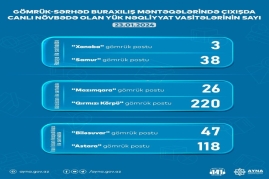 Gömrük-sərhəd məntəqələrində çıxışda gözləmədə olan nəqliyyat vasitələrinin sayı barədə məlumata əsasən, hazırda Astara gömrük postunda 118, Biləsuvar gömrük postunda 47, Mazımqara gömrük postunda 26, Xanoba gömrük postunda 3, Samur gömrük postunda 38 yük maşını var.