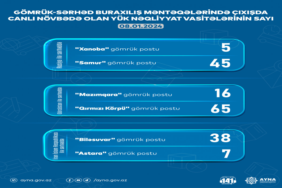 Avtosfer.az Azərbaycan Yerüstü Nəqliyyat Agentliyinə (AYNA) istinadən xəbər verir ki, hazırda "Samur" gömrük postunda 45, "Mazımqara" gömrük postunda 16, "Qırmızı Körpü" gömrük postunda 65, "Biləsuvar" gömrük postunda 38, "Astara" gömrük postunda 7 yük maşını gözləyir.