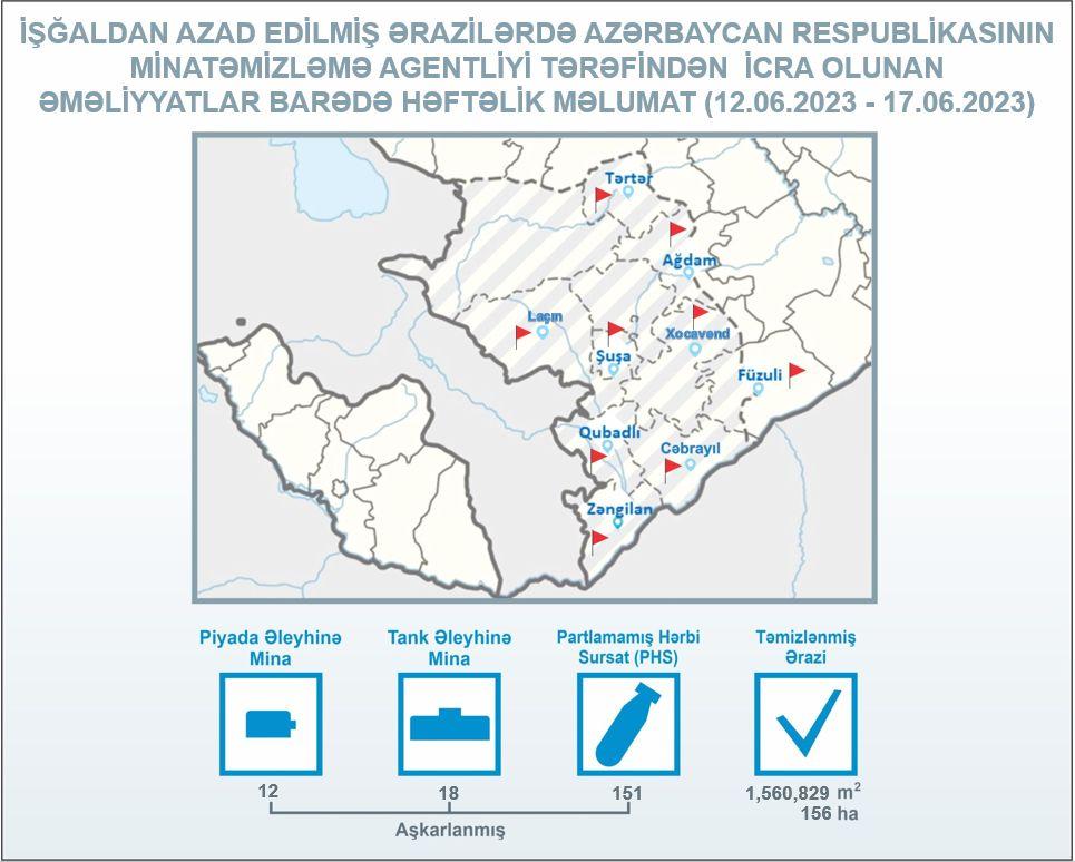 ANAMA-dan verilən məlumata görə, iyunun 12-dən 17-dək Tərtər, Ağdam, Füzuli, Şuşa, Qubadlı, Cəbrayıl və Zəngilanda aparılan minatəmizləmə əməliyyatları zamanı piyada əleyhinə 12, tank əleyhinə 18 mina və 151 partlamamış hərbi sursat aşkarlanaraq zərərsizləşdirilib.