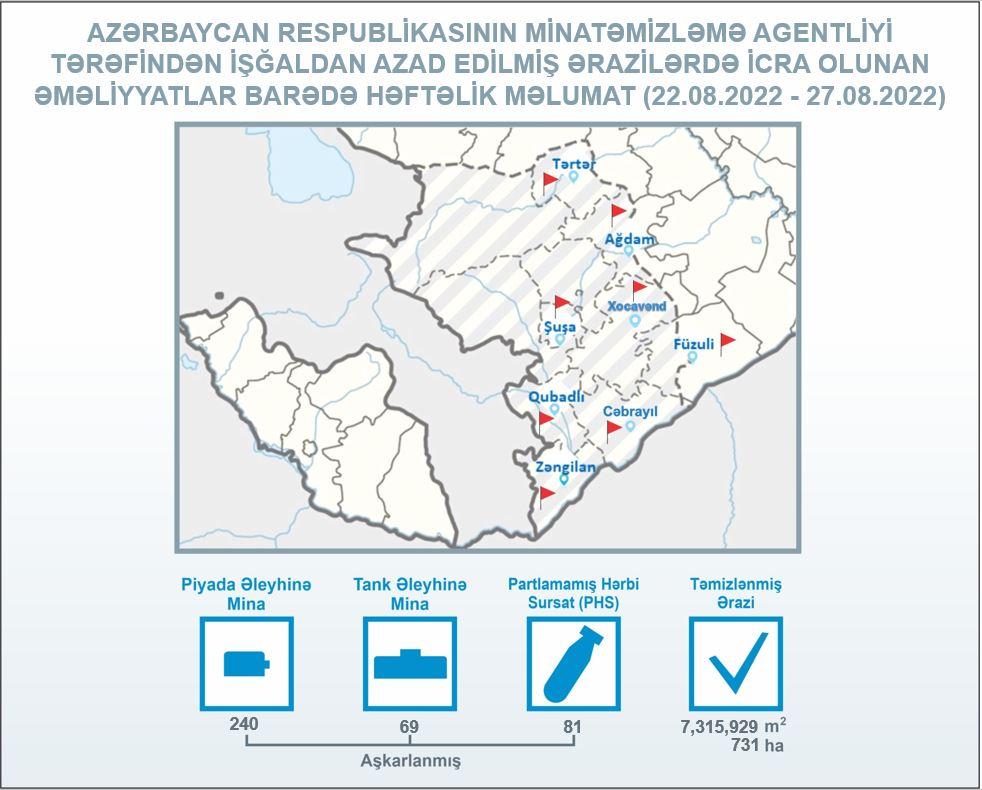 ANAMA-dan verilən məlumata görə, avqustun 22-dən 27-dək Tərtər, Ağdam, Xocavənd, Füzuli, Şuşa, Qubadlı, Cəbrayıl və Zəngilanda aparılan minatəmizləmə əməliyyatları zamanı piyada əleyhinə 240, tank əleyhinə 69 mina və 81 partlamamış hərbi sursat aşkarlanaraq zərərsizləşdirilib.