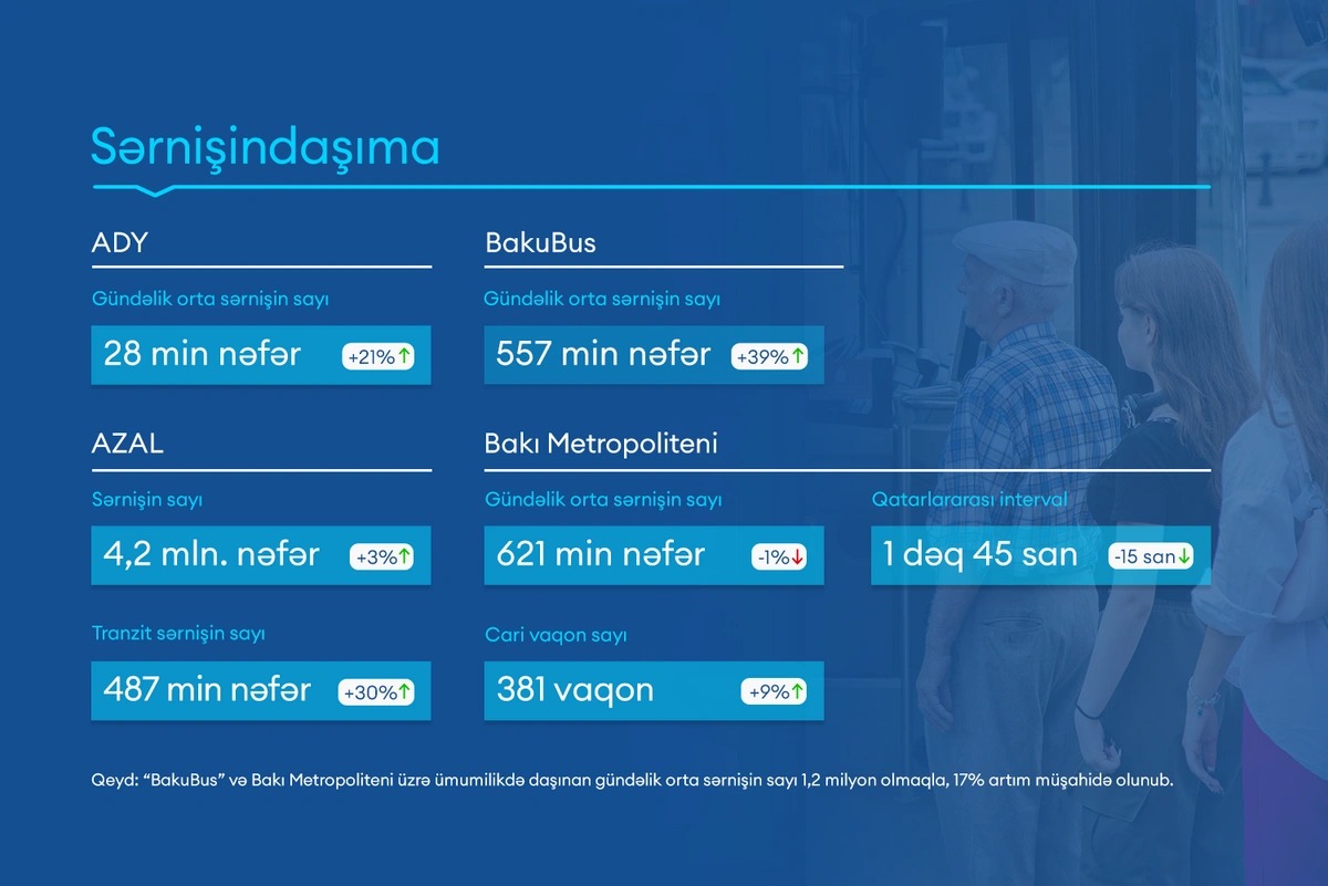 Sərnişindaşıma sahəsində hesabat dövründə "Azərbaycan Dəmir Yolları" QSC (ADY) üzrə gündəlik orta sərnişin sayı 28 min nəfər təşkil edib ki, bu da əvvəlki dövrlə müqayisədə 21 % artım deməkdir. "BakuBus" marşrut xətləri ilə daşınan gündəlik orta sərnişin sayı ötən dövrlə müqayisədə 39 % artaraq 557 min nəfərə çatıb. Bakı Metropoliteni üzrə daşınan gündəlik orta sərnişin sayı isə əvvəlki illə müqayisədə metronun "Həzi Aslanov" stansiyasında əsaslı təmir və yenidənqurma işlərinə başlanılması səbəbindən 1 % azalaraq 621 min nəfər olub. Beləliklə, "BakuBus" MMC və "Bakı Metropoliteni" QSC üzrə ümumilikdə daşınan gündəlik orta sərnişin sayı 1,2 milyon olmaqla, 17 % artım müşahidə olunub.