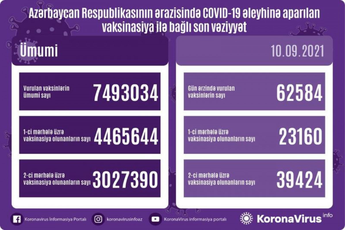 Ölkədə vurulan vaksinlərin ümumi sayı 7493034, birinci mərhələ üzrə vaksinasiya olunanların ümumi sayı 4465644, ikinci mərhələ üzrə vaksinasiya olunanların sayı isə 3027390 təşkil edir.