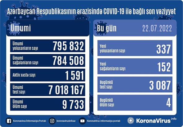 Azərbaycan Respublikasında koronavirus (COVID-19) infeksiyasına 337 yeni yoluxma faktı qeydə alınıb, 152 nəfər müalicə olunaraq sağalıb.