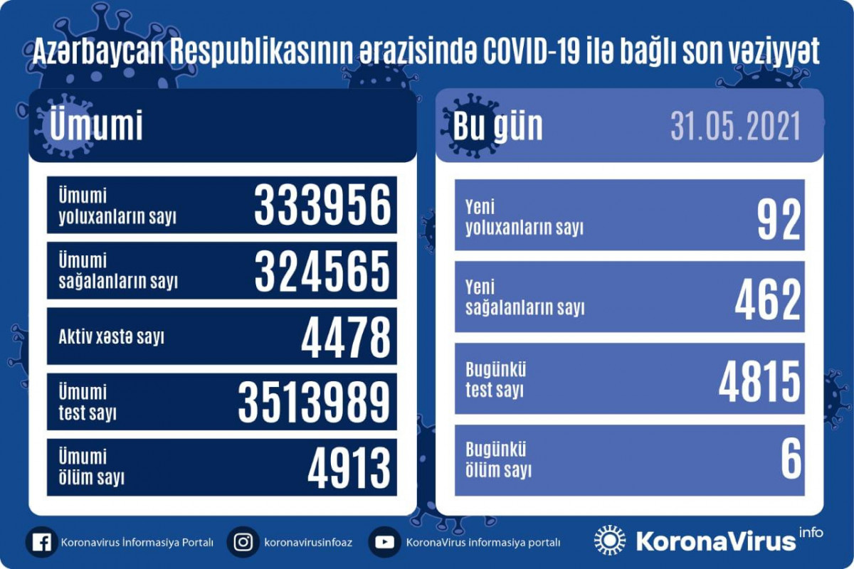 Azərbaycan Respublikasında koronavirus (COVID-19) infeksiyasına 92 yeni yoluxma faktı qeydə alınıb, 462 nəfər müalicə olunaraq sağalıb.
