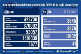 Azərbaycanda koronavirus (COVID-19) infeksiyasına 3845 yeni yoluxma faktı qeydə alınıb, 3876 nəfər müalicə olunaraq sağalıb.