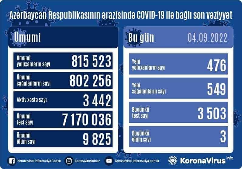 Azərbaycanda koronavirus (COVID-19) infeksiyasına 476 yeni yoluxma faktı qeydə alınıb, 549 nəfər müalicə olunaraq sağalıb.