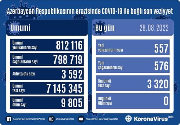 Azərbaycan Respublikasında koronavirus (COVID-19) infeksiyasına557 yeni yoluxma faktı qeydə alınıb, 576 nəfər müalicə olunaraq sağalıb.